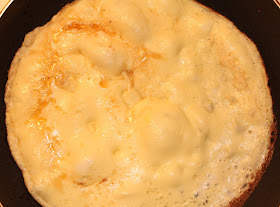 Melt a small amount of butter onto your HOT frying pan...if it bubbles you know your pan is hot enough and  you can pour in your egg and milk mixture. At this point I move the pan in a circular motion, just slightly enough to evenly spread the egg mix all over the bottom of the pan. The trick to omelet making for me is to use a rubber spatula and every so often as the egg cooks run it round the entire outside of the flattened egg pie, lifting a little as you go. This will help to ensure a nice even cooking and an omelet that doesn't stick on one side when you go to flip it closed later on.